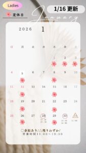 2025年10月21日 / 最終更新日時 : 2026年1月16日 laclef お知らせ ラクレ空き状況 ※空き状況は1週間ごとに更新しています ↓レディースの空き状況はこちらです↓ ↓メンズの空き状況はこちらです↓ Follow me! FacebooktwitterHatenaPocketCopy
